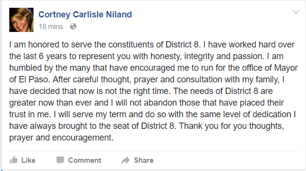 The word on the street is that District 8 Representative Cortney Niland was considering a run for mayor.