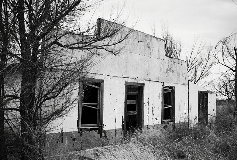 Below is the crumbling Lingo Baptist Church, reportedly also used by other denominations on occasion, possibly after a second church in town closed. The general store is shown at the top of this post. Other buildings included a café, hardware store, basketball gym, and a shop in a Quonset hut, none of which still stand.