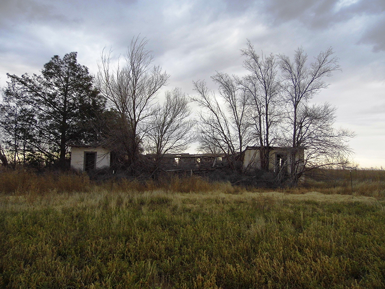 Now, I often feel like City of Dust is in a race against dusty oblivion as so many of the buildings documented on this website are disappearing fast, and those in Lingo are no different. But unlike Lucy, NM, where I got there too late to photograph the old school or the Formwalt house, in this case I arrived just in the nick of time. Shown above and at left is the post office, where around 1953 a Mrs. Balko was postmistress. Mrs. Fanny Brown took the position on April 20, 1968, staying until the post office closed in 1984 (possibly on November 2). I visited on December 12, 2015 and on Valentine’s Day 2016 the old PO burned to the ground. Apparently someone was driving a pick-up with a BBQ grill in the back and hot coals became airborne. Numerous blazes were started, consuming a total of 1,083 acres in southeastern Roosevelt County, but at least no one was hurt and no other structures were damaged.