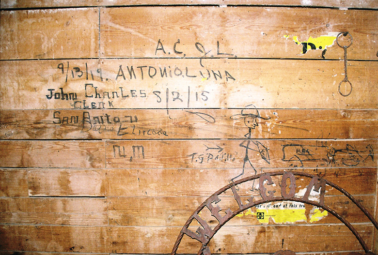 Below is a shot of some almost 100-year-old graffiti from inside the depot. Note the infinity sign/hat brim. Could it be the mark of the original train-hopping Bozo Texino?