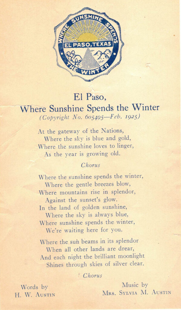During a stretch of particularly gloomy weather in January 1926 composer Sylvia Austin was on the blunt end of teasing, “I’ve been laughed at quite a bit lately for writing the song about ‘El Paso, Where Sunshine Spends the Winter. But I think that sunshine is coming back, it sure will stay. Even at that sunshine has been with us quite a bit, and if we want it to work for us, we can only expect it to want a vacation once in a while.”xv