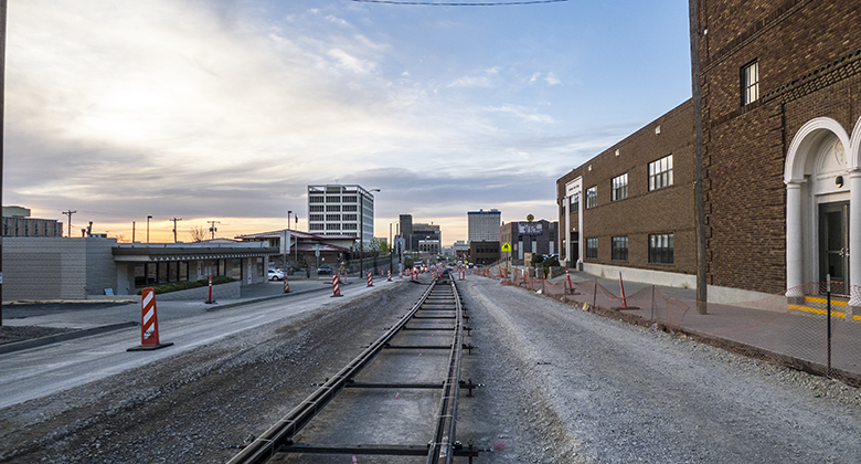 In the video, Martin Bartlett explains that the trolley tracks run down the middle of Stanton Street instead of on one side because Stanton Street is changing. Instead of two lanes north and two lanes south, like it is now, Stanton Street will have one lane each direction, with the trolley tracks between them. They’re also converting one of the existing lanes to a two-lane bike path.