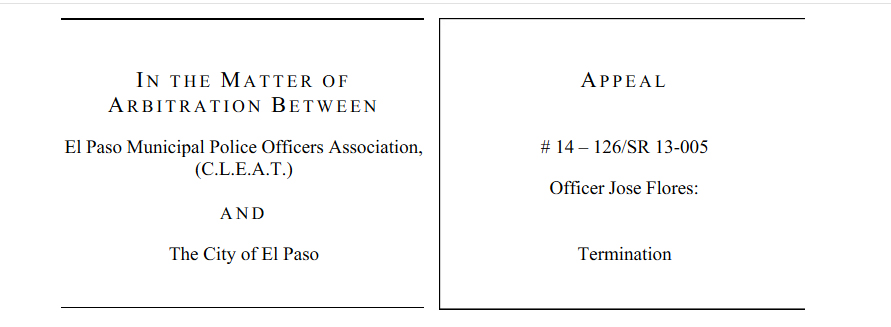 El Paso Times Editor Bob Moore alerted us, via Facebook, to the arbitrator’s ruling on the decision to reinstate Officer Jose Flores, the El Paso Police Department Officer who shot handcuffed prisoner Daniel Saenz in the sally port of the El Paso County Jail. The ruling was posted on the website Scribd.com by the El Paso Times.
