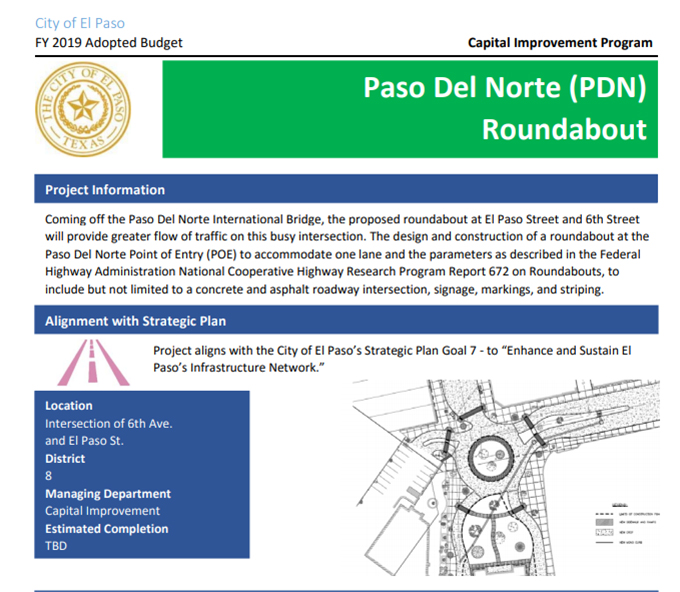 “Coming off the Paso Del Norte International Bridge, the proposed roundabout at El Paso Street and 6th Street will provide greater flow of traffic on this busy intersection.”