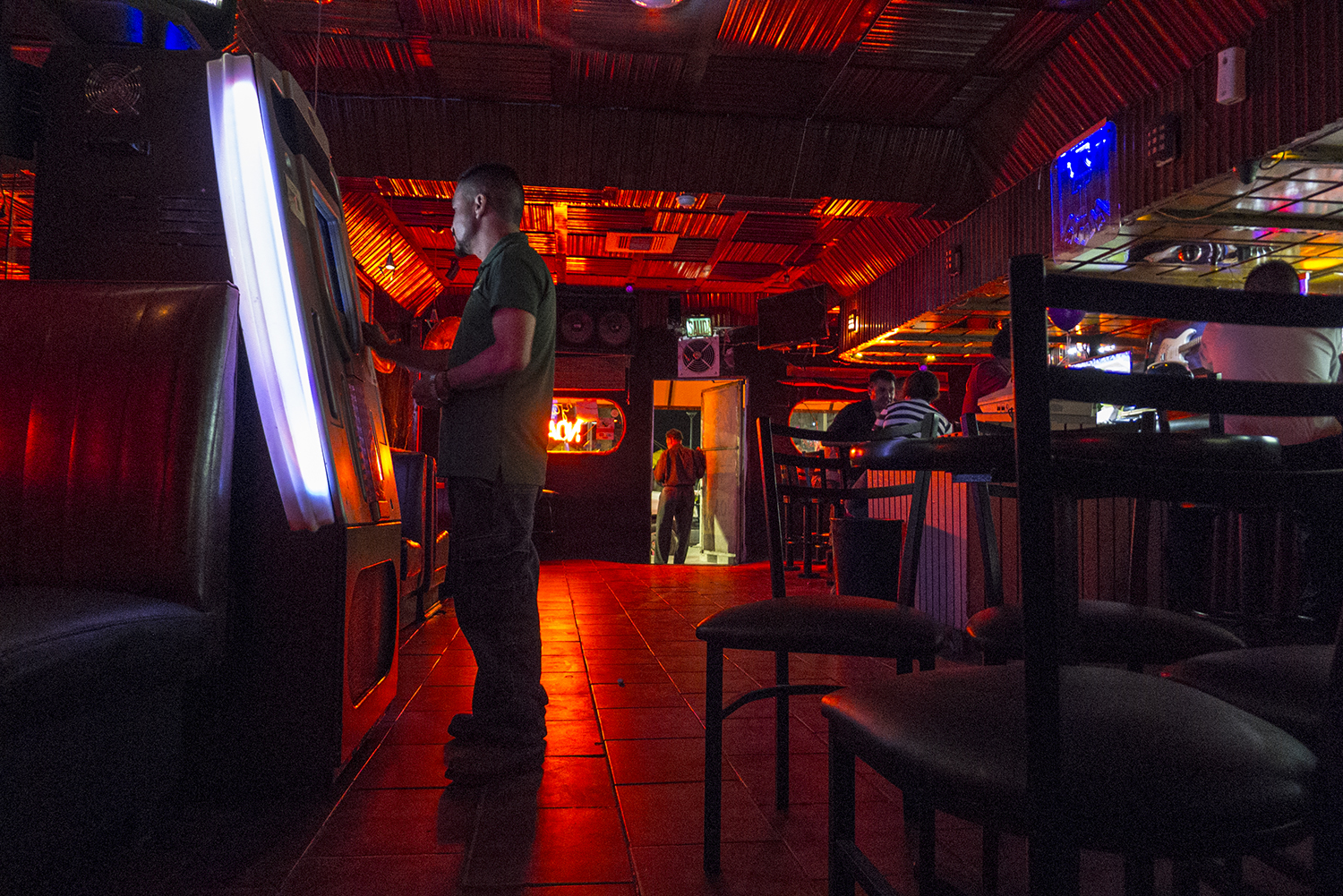 The Bombin is on a corner of that alley-street and Begonias. So the bouncer didn’t have a lot of time to react when I came around the corner. Not that I’m someone who needs reacting to. I slipped in behind him up the steps.