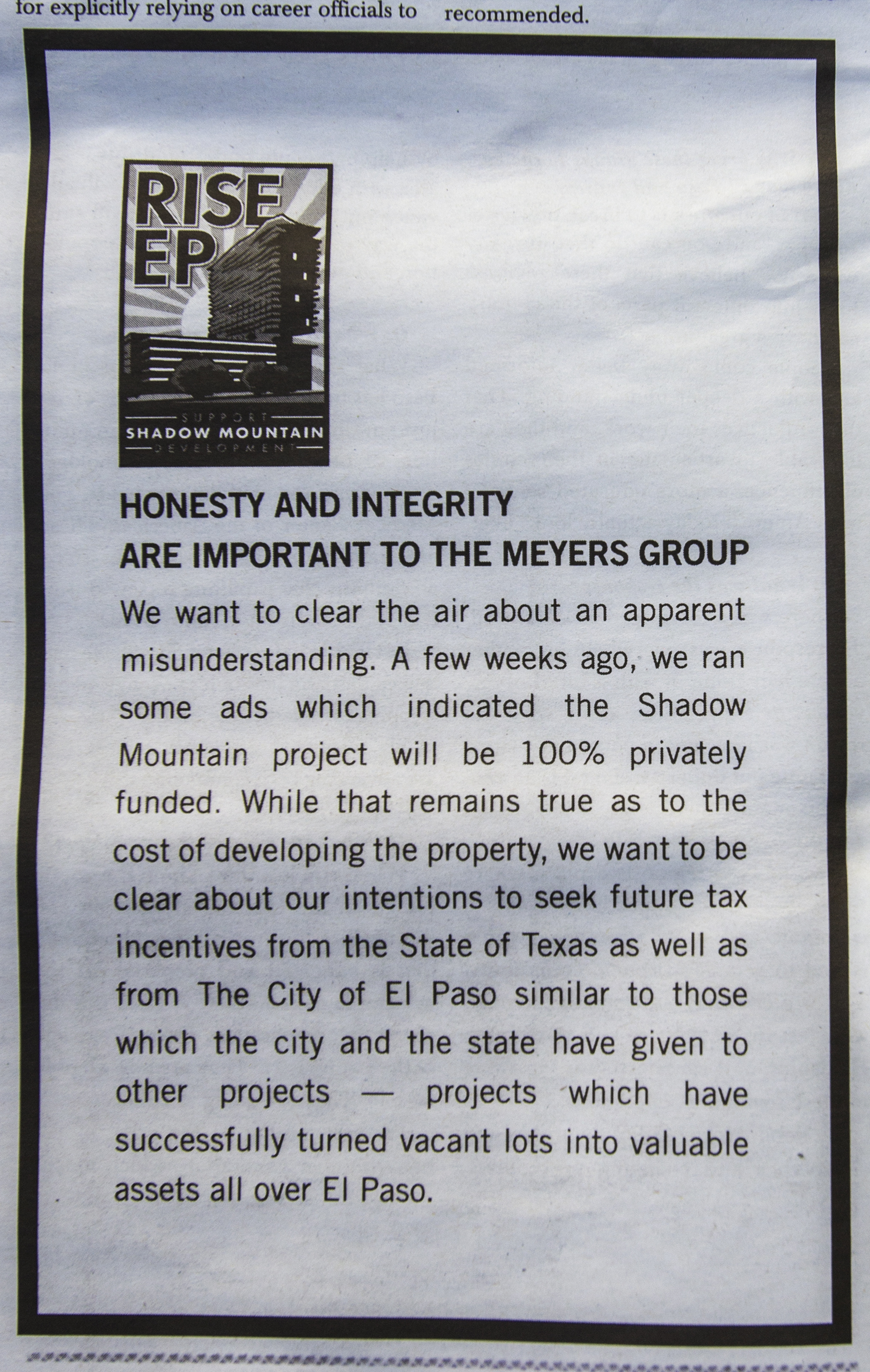 In an apparent bid to distinguish itself from other developers in town, the Meyers Group, those people who are trying to win approval for their 22-story luxury apartment tower on the west side, ran this ad touting their honesty and integrity in this weekend’s El Paso Inc. Can you read that ad on your smart phone? Here’s the text.