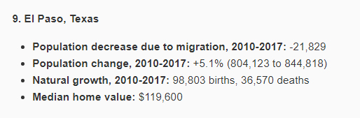 According to this story in the USAToday online (which an alert reader directed me to), El Paso was the ninth most popular city to move out of from 2000 to 2017.