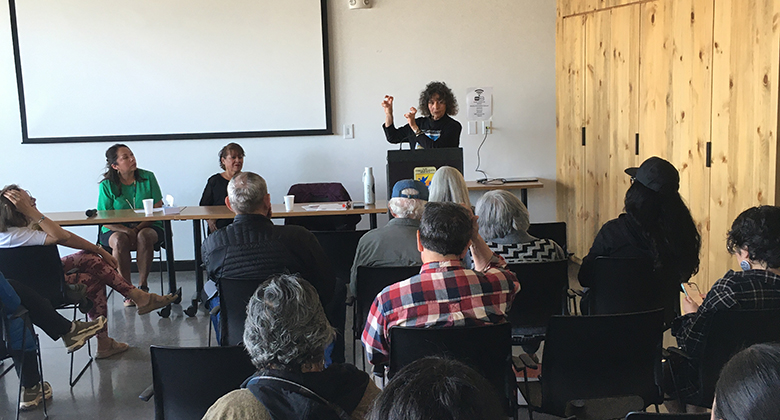Downwinder leader Tina Cordova speaks at the Valle de Oro Community Earth Day event. Seated to Cordova’s immediate left is Loretta Anderson and next to