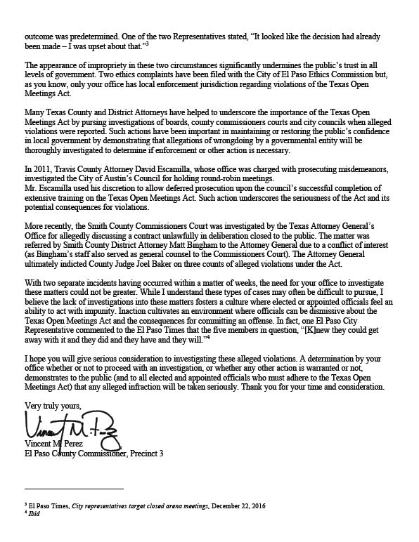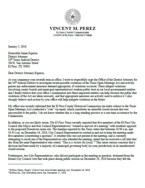 Precinct 3 Commissioner Vince Perez’ Letter to District Attorney Jaime Esparza