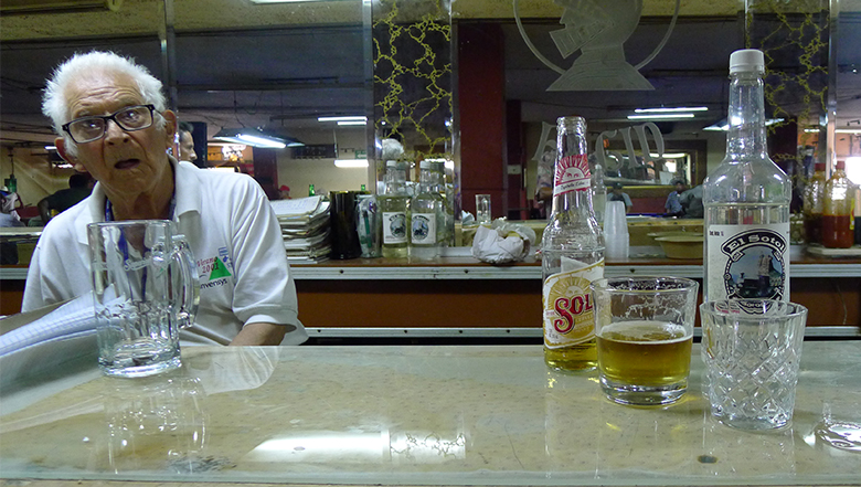 The clientele is exclusively male. Some days a woman tends bar, serving Sol by the media, but mostly Carta Blanca by the caguama. (A media is the metric approximate of a twelve-ounce bottle, and a caguama a quart.) The man in charge of the register is in his eighties with glasses, a full head of white hair, and a frequent smile.