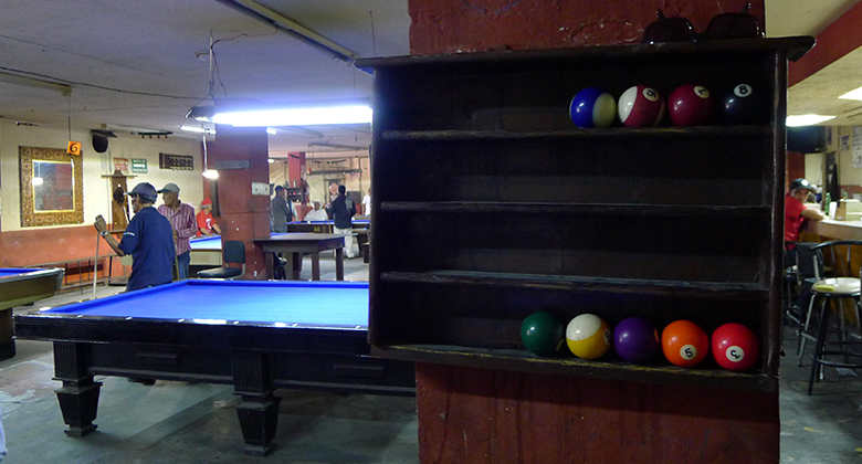Most of the tables are reserved for pool of the Mexican variety, a rotation game that starts with the balls on the rails at the spots. After each turn, the shooter empties the pockets and puts the balls he made on his shelf. Each ball is worth it’s number (except the three which is worth six) and the first player to 25 wins.