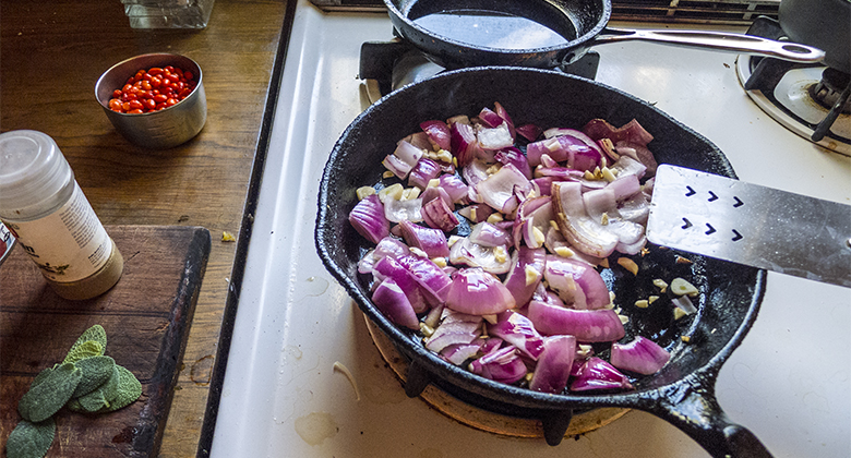 I took five cloves of garlic and sliced them, fine, and a purple onion and diced it, coarse. Then I fried them in a little olive oil in the black pan. I left them on the heat till the garlic was brown and toasted. Toasted garlic tastes different than raw garlic.