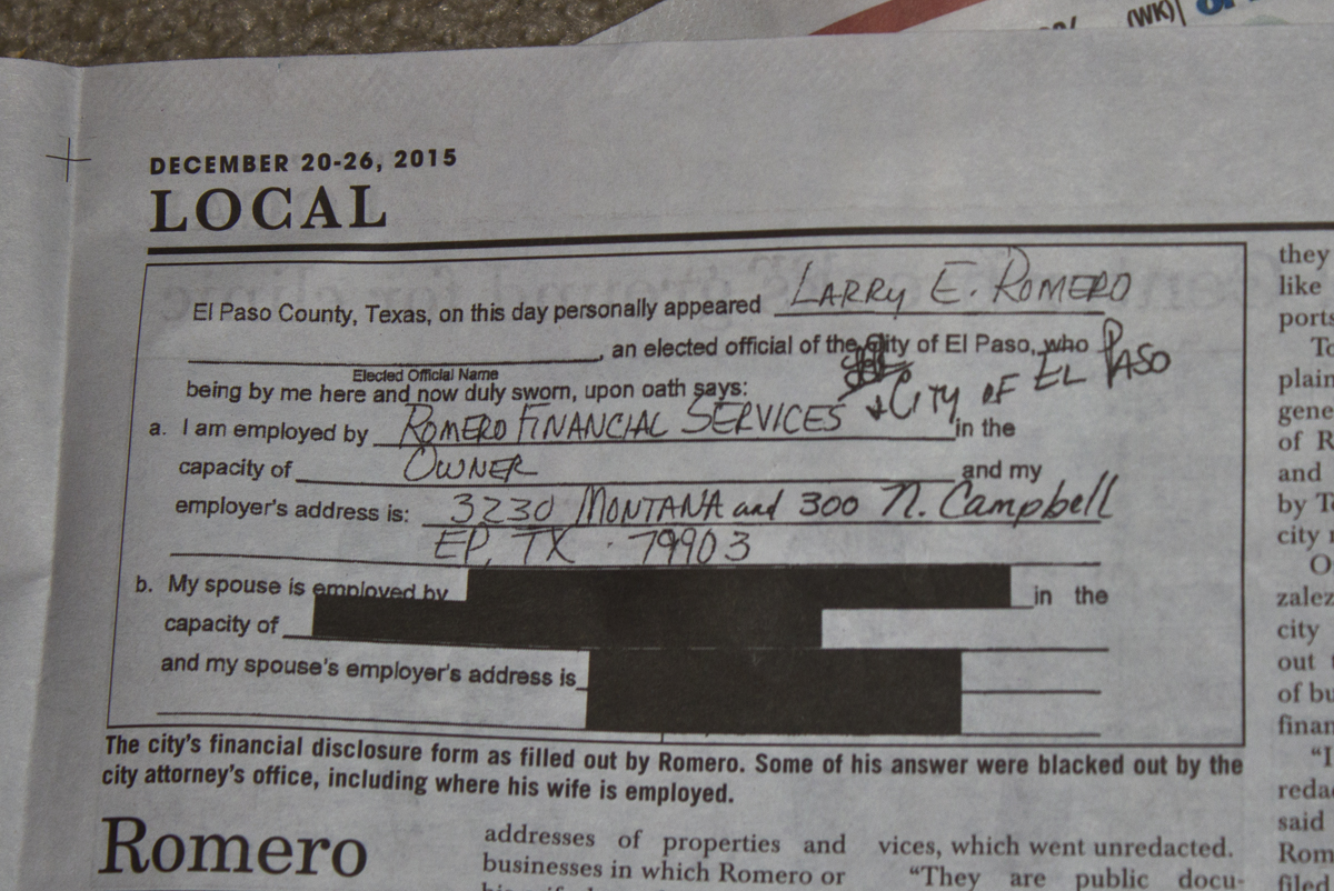 El Paso Inc. received copies of Romero’s disclosure forms that the city attorney’s office provided to [blogger, candidate, and civic activist] Jim Tolbert after redacting or blacking out information concerning his wife’s employer and occupation.