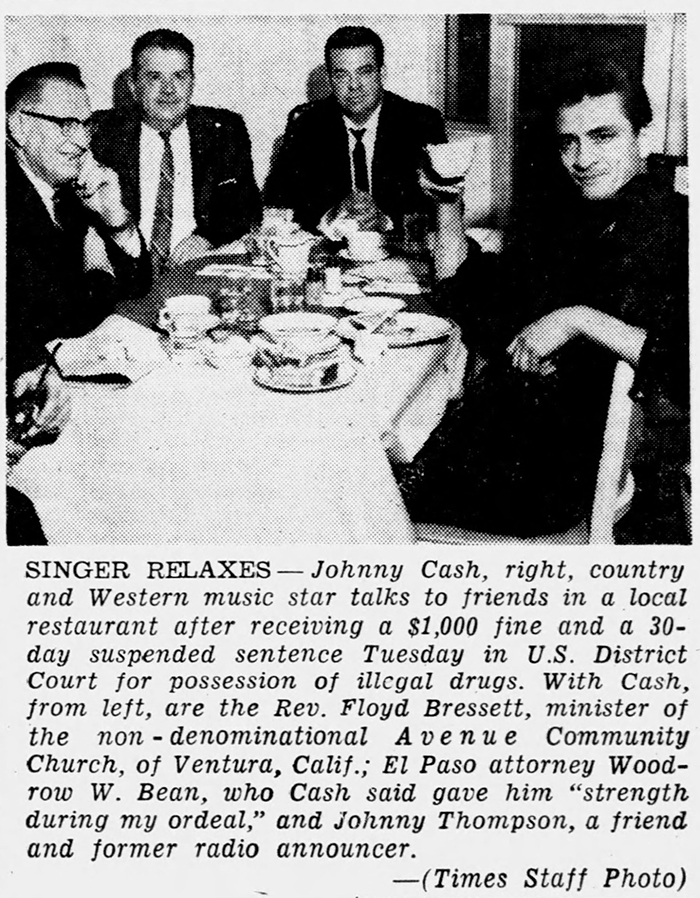 Cash had just completed a three-week tour in Ohio and Michigan when he arrived at the El Paso courthouse for his March 8, 1966 sentencing trial. Accompanying the defendant were his attorney Woodrow W. Bean; Don Law, vice president and recording agent for Columbia Records Nashville office; and Reverend Floyd Gresset of the Avenue Community Church in Ventura County, California.iii