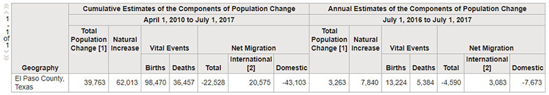 For the year ending July 1, 2017, El Paso County experienced a net population growth of 3,263 people. There were 13,224 people born, and 5,384 people died, resulting in a natural increase of 7,840. Our international net migration was 3,083, (incoming to El Paso County from other countries less leaving El Paso County to other countries), and our net domestic migration was -7,673.