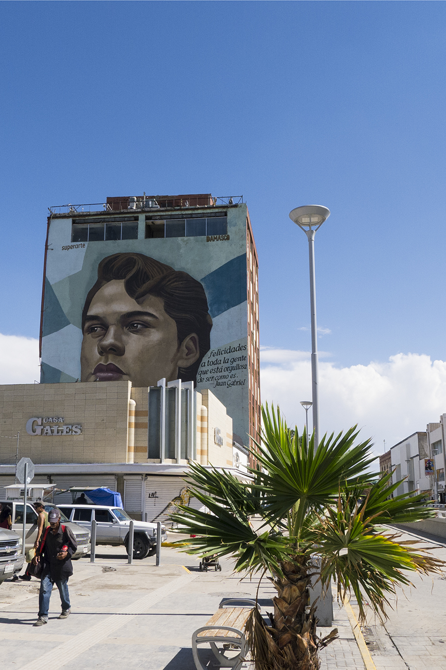 On Avenida Juarez, Juanga stares down from a seven story mural. Felicidades a todo la gente que esta orgulluso de ser como es, is written in script on the mural.