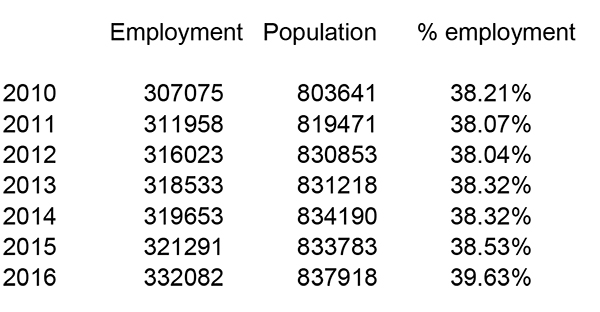 From 2010 to 2016, employment as a percentage of population has been pretty constant.
