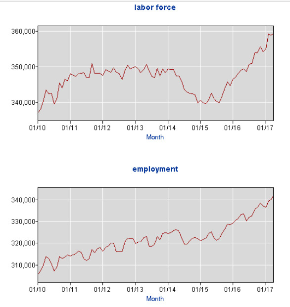 The Labor Force, i.e., the number of people participating in the labor market, i.e., working, or looking for work, takes a pretty decided jump there about July, 2015, after an anomalous bump in about April. What happened?