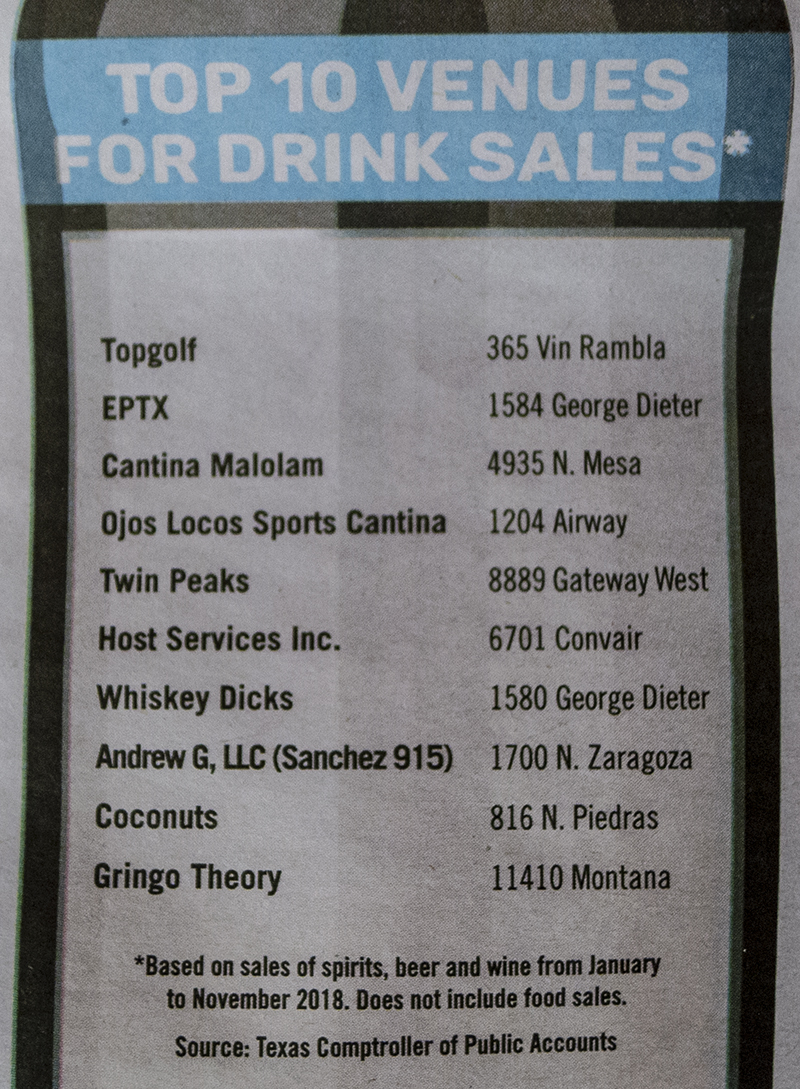 Topgolf, which opened on the Westside last February, sold more beer, wine and spirits than any other El Paso venue in 2018, according to state data.